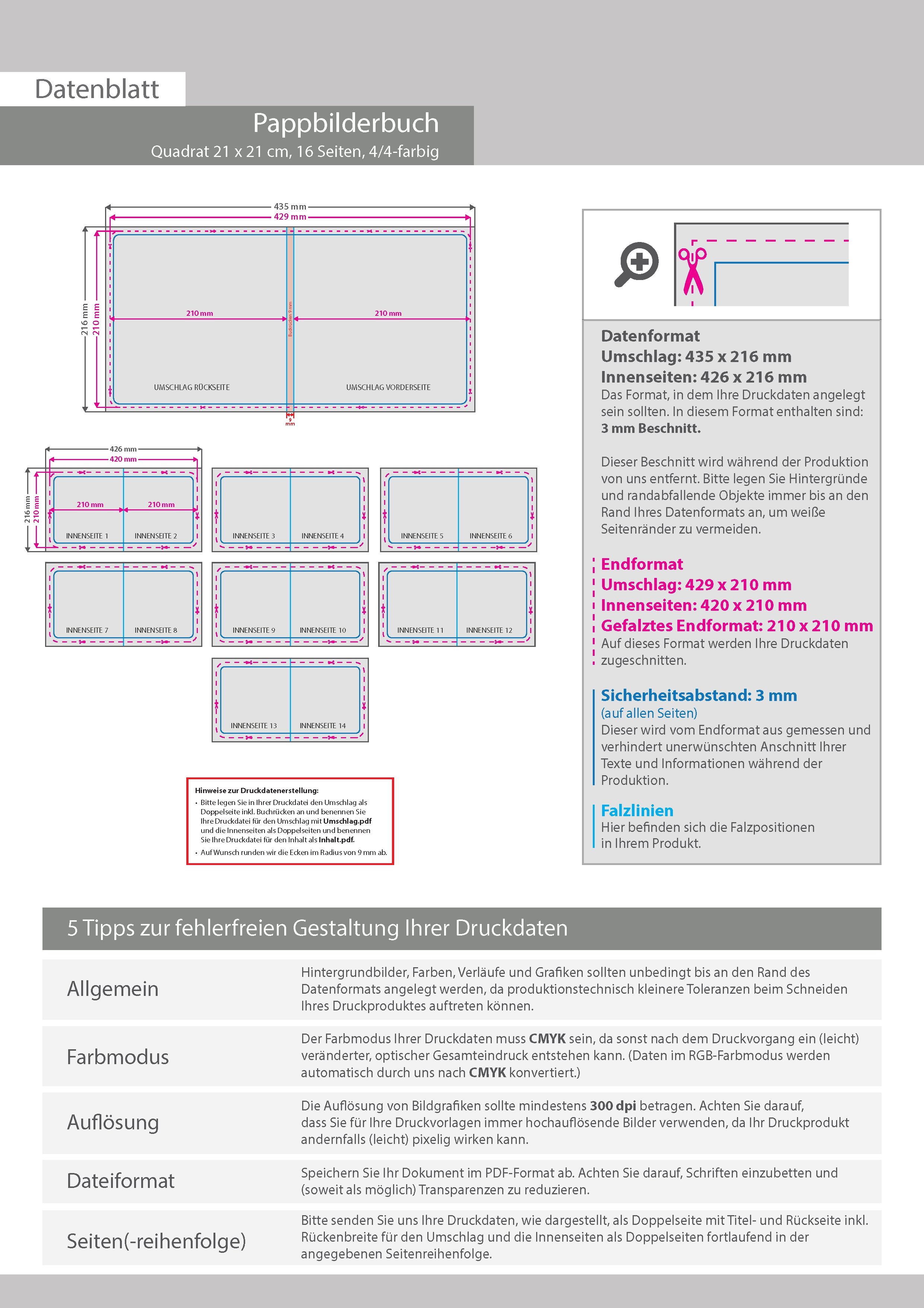 Pappbilderbuch mit Lay-Flat-Bindung, Quadrat 21 x 21 cm, 16 Seiten, 4/4-farbig beidseitig bedruckt