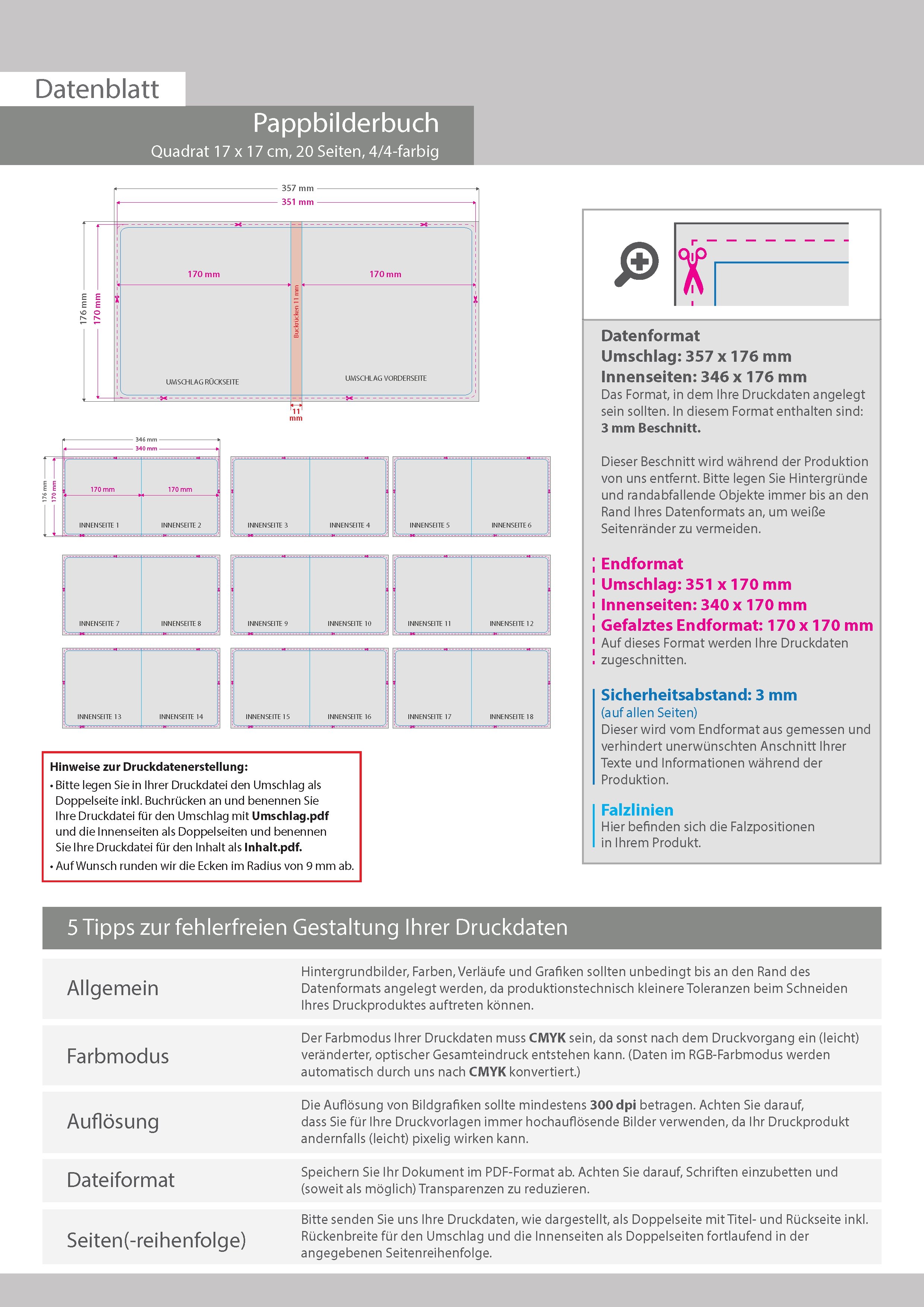 Pappbilderbuch mit Lay-Flat-Bindung, Quadrat 17 x 17 cm, 20 Seiten, 4/4-farbig beidseitig bedruckt